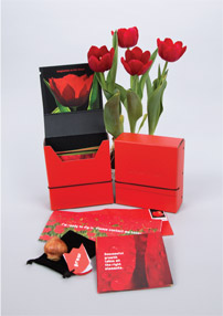 The emerging concept centered around sending a red tulip bulb (a Big Red Darwin Hybrid: the Voorstellen logo icon) within designed packaging (debossed/labeled) housing several integrated components (pictured at right): accordion flyer, velvet bag with red crinkle excelsior, die-cut hang-tag with planting instructions, response card, and addressed postage- paid return envelope.